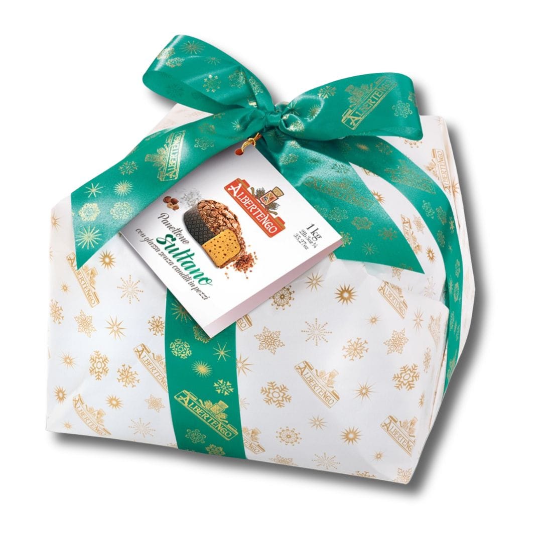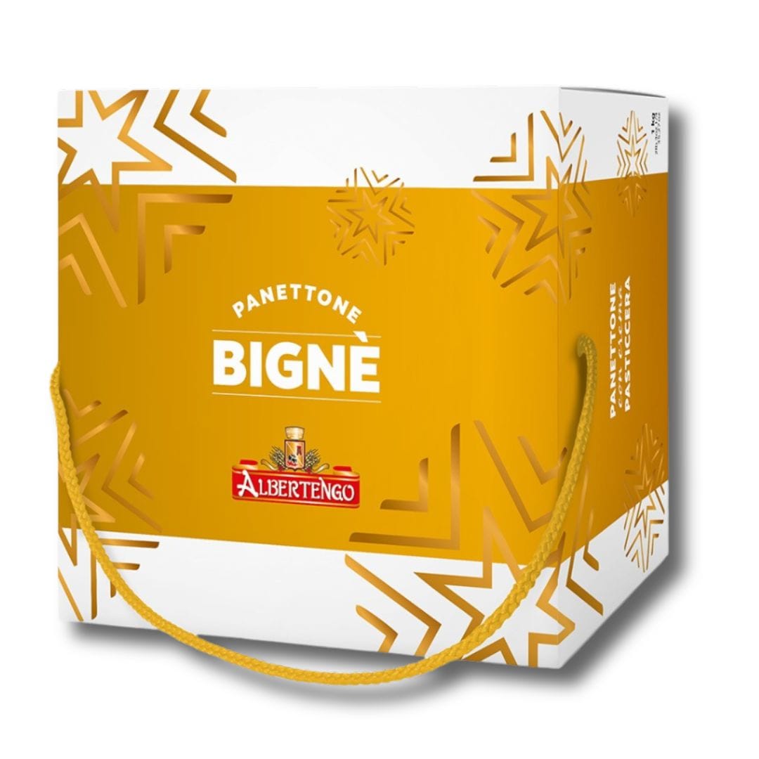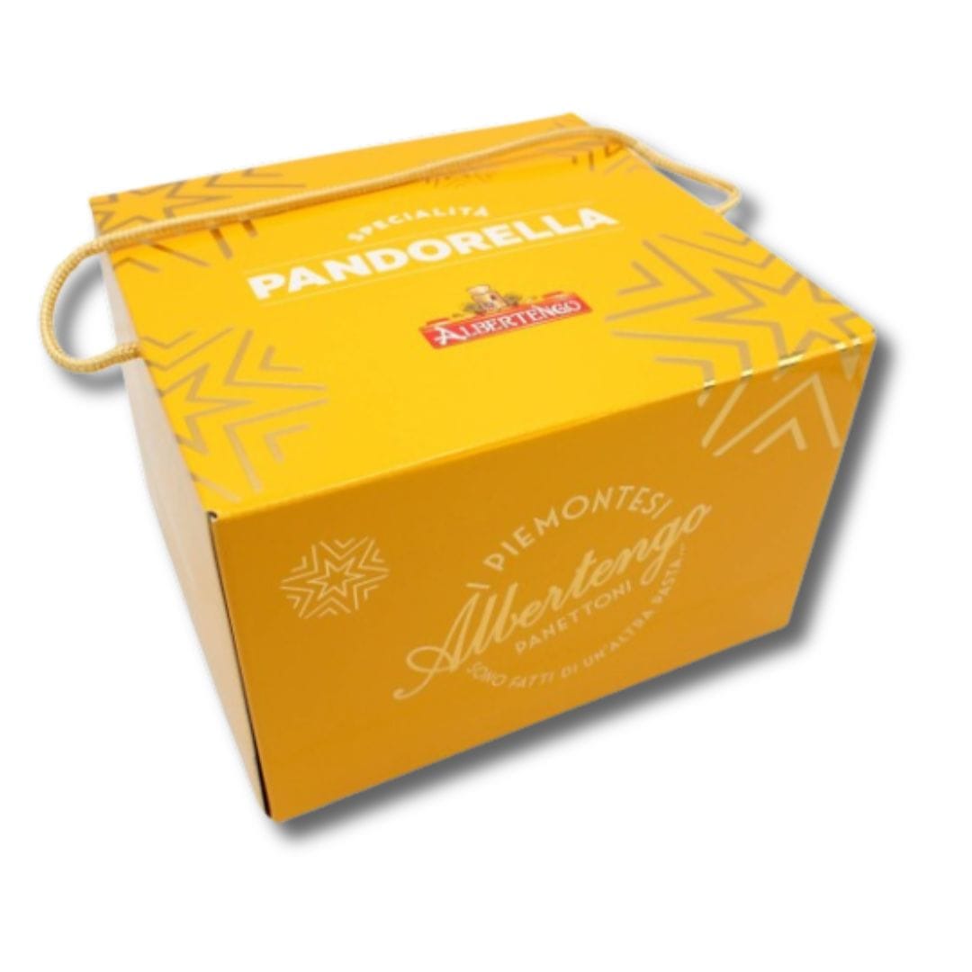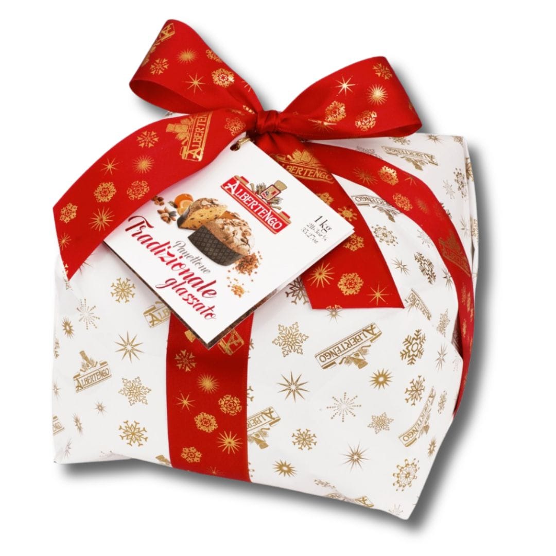 Panettone clásico Albertengo, fermentado de forma natural con masa madre, enriquecido con pasas y cáscaras de naranja confitada. Glaseado crujiente con almendras y azúcar, aroma intenso y sabor auténtico de la tradición piamontesa.